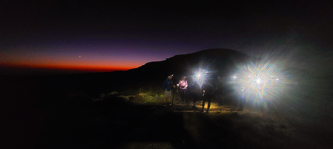 Esta travesía comienza con el espectáculo cromático del atardecer, ascendiendo mientras la luz se apaga y los frontales comienzan a dibujar una serpiente luminosa sobre la piedra. Las vistas desde el Puerto de las Presillas nos regalan la inmensidad del firmamento.